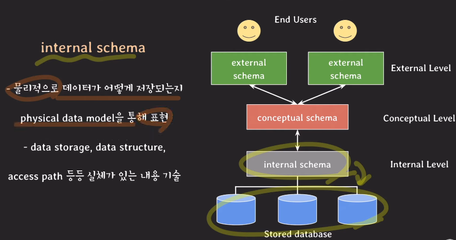 각 레벨을 독립시켜서 어느 레벨에서의 변화가 상위 레벨에 영향을 주지 않기 위함. 대부분의 DBMS가 three level을 완벽하게 혹은 명시적으로 나누지는 않음. 데이터가 존재하는 곳은 internal level