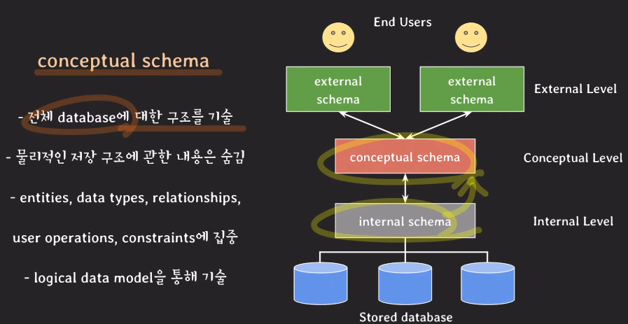 -conceptual data model : 일반 사용자들이 쉽게 이해할 수 있는 개념들로 이뤄진 모델. 추상화 수준이 가장 높음. 비즈니스의 요구 사항을 추상화할 떄 사용 (eg. entity-relationship model)