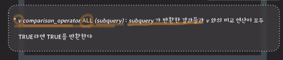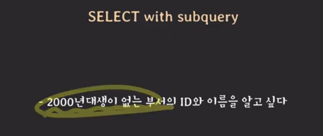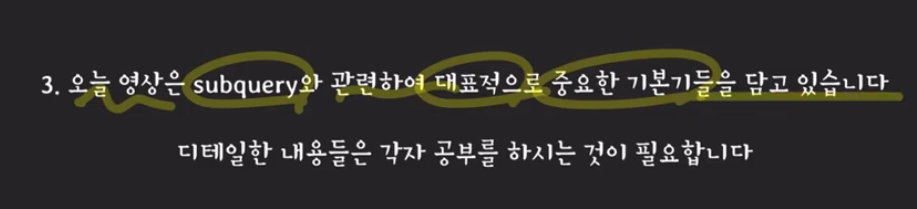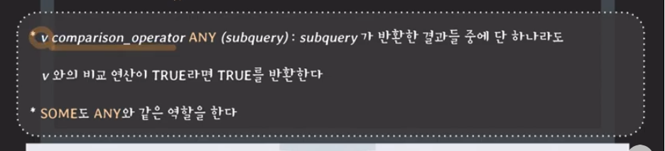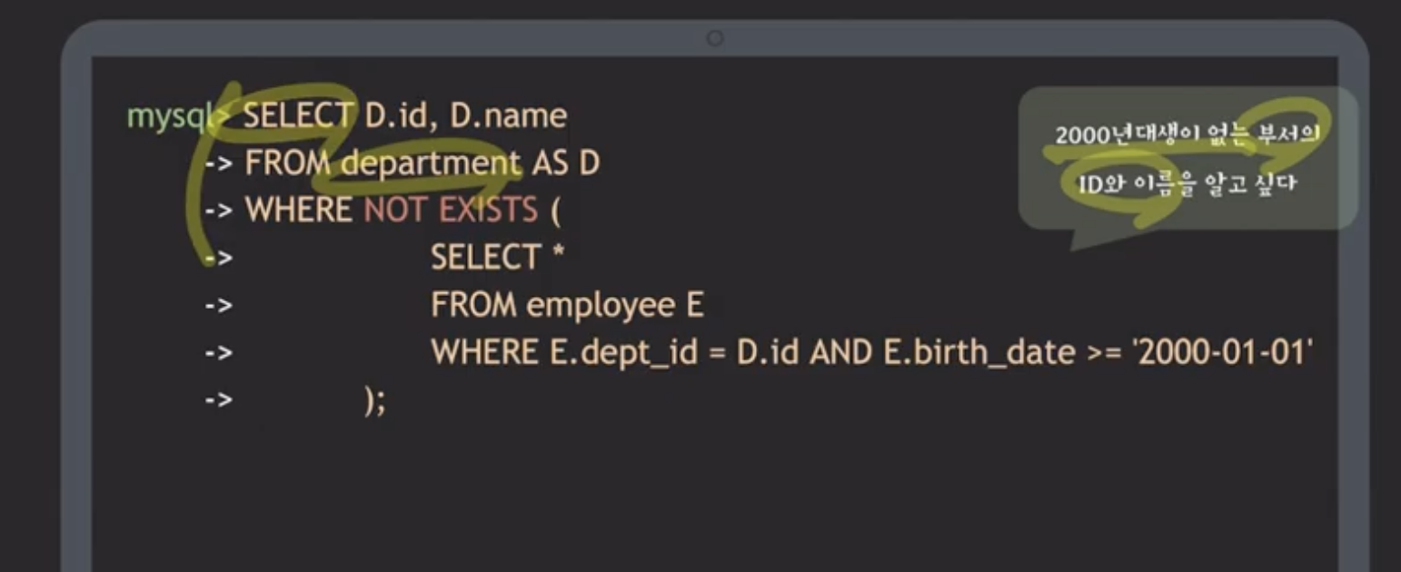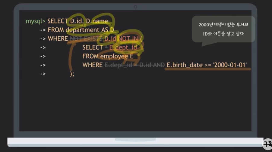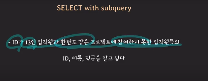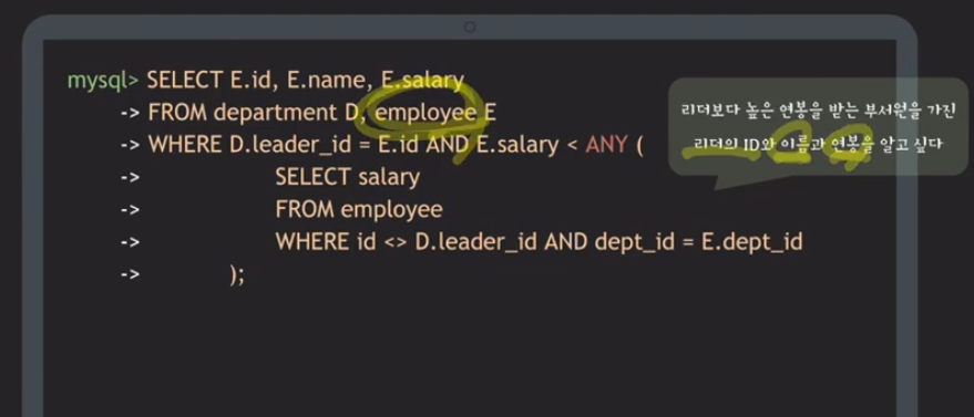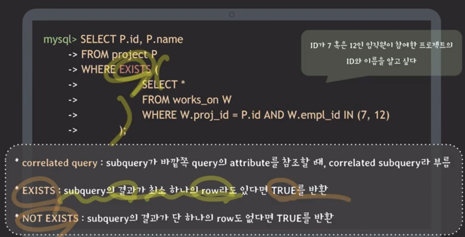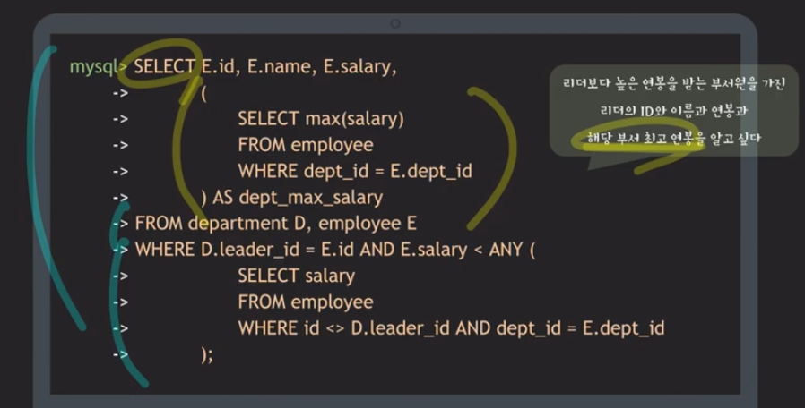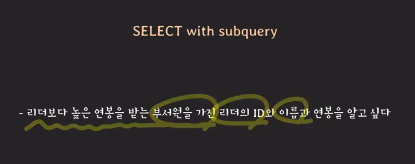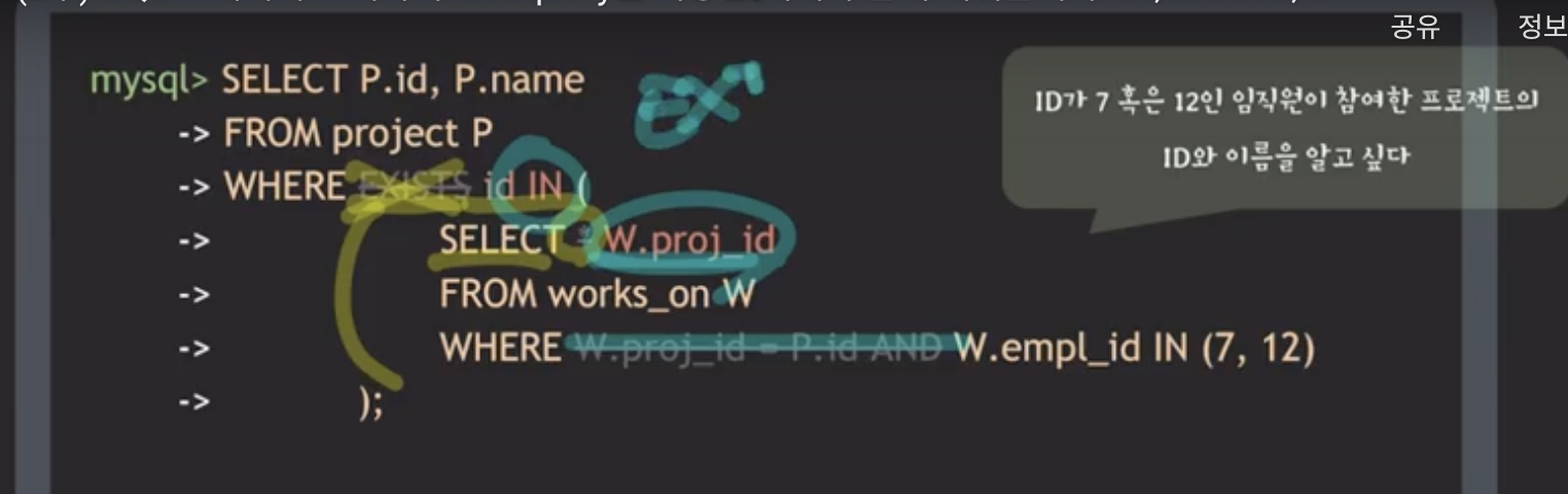 인강 보습 (인프런,유데미,패스트캠퍼스)/인프런 데이터베이스 개론 & SQL 쿼리 안의 쿼리 (subquery) kwohyuno 2023. 2. 5. 17:14 두 쿼리를 할 번에 실행할 수 있을까? 당연히 있다 임플로이 아이디가 5인 것은 제외 (empl_id !=5). DISTINCT로 중복 값 제외 OR로 묶은 것을 IN으로 해도 된다 두 쿼리를 합칠 수 있음 이름까지 가져오는 방법 From 절에 넣는 방법 메시와 제니가 속한 부서의 최고 연봉을 표시 참고사항